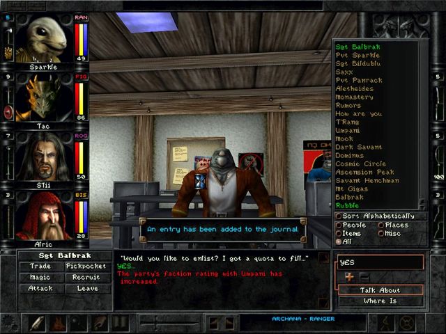 Wizardry 8 begins with your party’s spaceship crash-landing into the world of Dominus, where you are searching for MacGuffins of incalculable power before the bad guy finds them. The plot, as is par for the Wizardry course, is pretty weak. The developers tried to create a detailed world with shifting alliances and political intrigue. They failed. In large part this failure is because of the horrible interface you use to talk to NPCs, which is similar to Morrowind’s terrible “choose from this list of six hundred nouns until you find something this NPC cares about” UI. I won’t focus on the plot for the rest of this review, except to note that because the plot tells a story, most of the significant battles and powerful items are statically placed. Yes, there are random encounters and some random treasure, but the most interesting set-piece battles (and the most rewarding weapons and magic items) are always in the same place. I think that’s something of a letdown, but I understand the reasoning behind it.